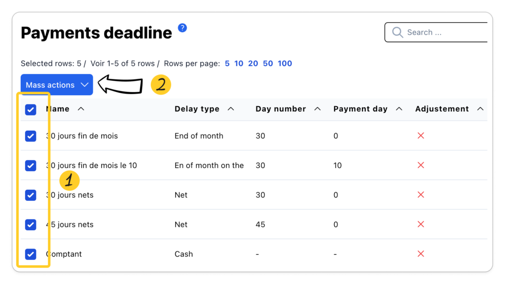 Select the desired payment deadlines, then click on ‘Mass actions’ > ‘Delete’.