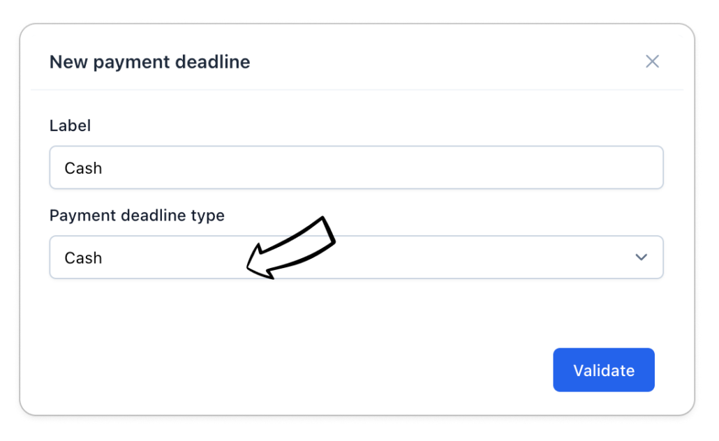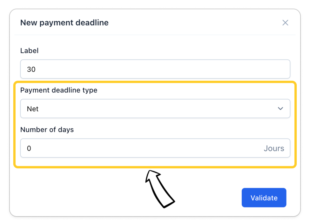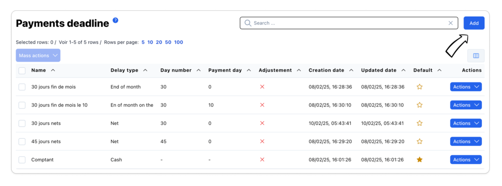 From the list of payment deadlines, click on the ‘Add’ button, then define the parameters for the payment deadline.