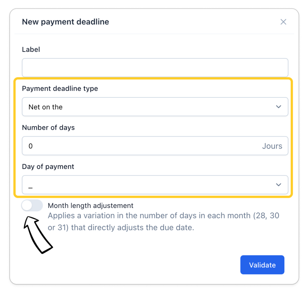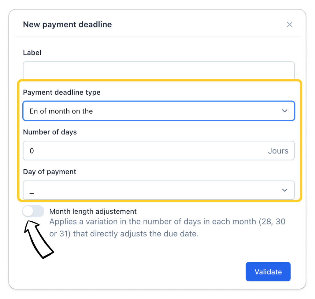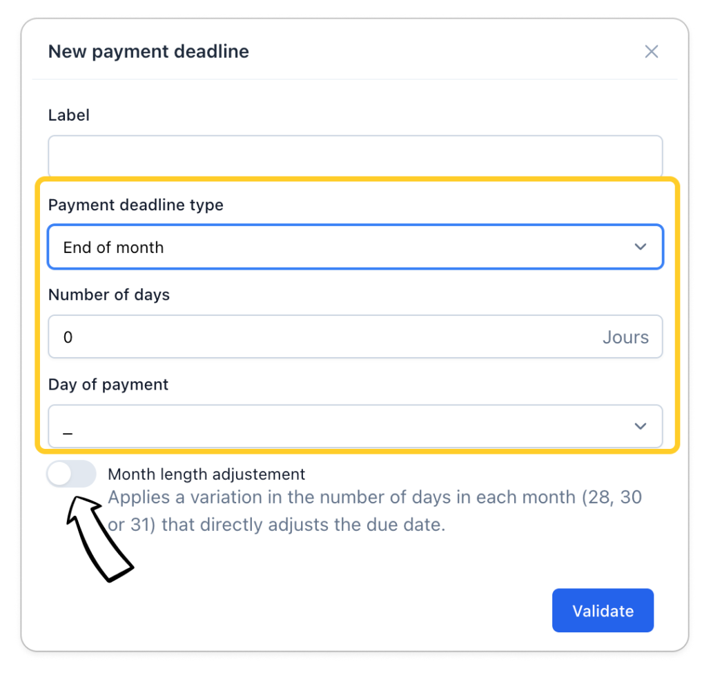 - End of month on the : Apply a number of days to calculate the due date of your document, which will automatically be extended to the last day of the following month and then postponed to the end of the month in question. The due date will then be extended to X days from the date of the finalised purchase or sale document, extended to the last day of the following month and then pushed back to the specified day.