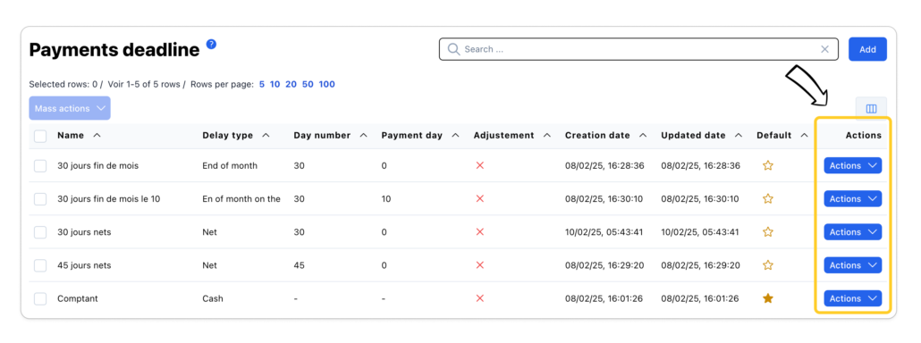 Click on the ‘Actions’ > ‘Edit’ button from the desired payment deadline line. You can make the change and then click on ‘Save’.