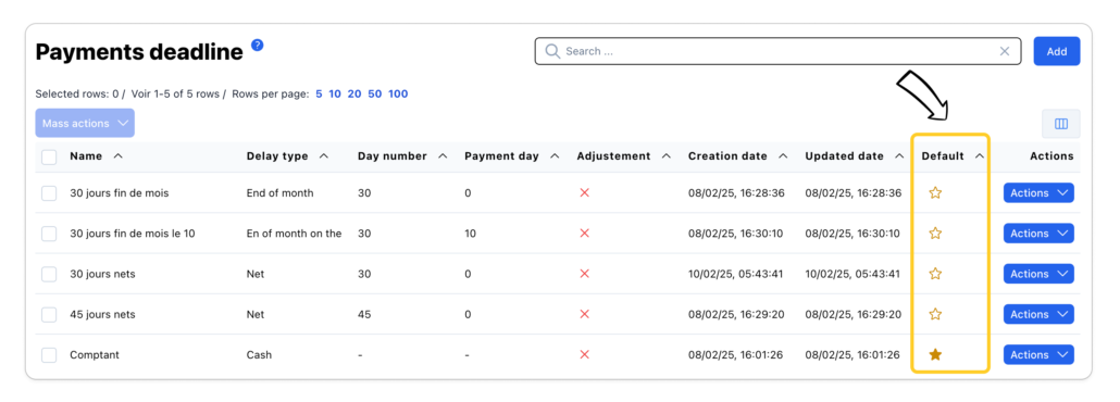 The default payment term is symbolised by the gold star. Once you have defined your default payment term, it will be proposed on your purchase and sales documents, unless you have applied a specific payment term to a customer or supplier.