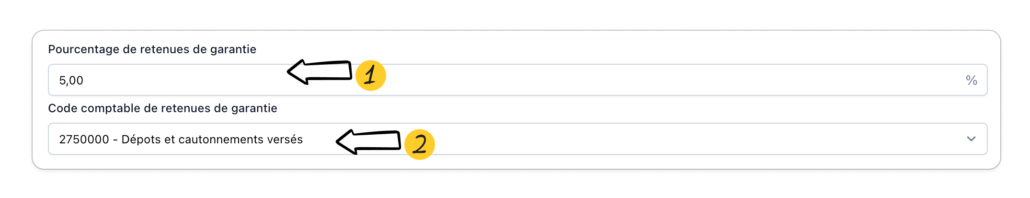 - Définir le codes comptables sur lequel ventiler la retenue de garantie (Par défaut le code 2750000 – Dépôts et cautionnements versés et proposé)