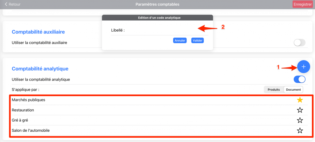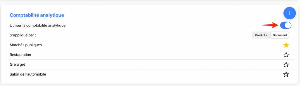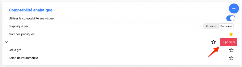 Cliquer sur le bouton « + » pour ajouter un code analytique. Vous pouvez également définir le code analytique à proposer par défaut soit aux produits soit aux documents en cliquant sur l’étoile.