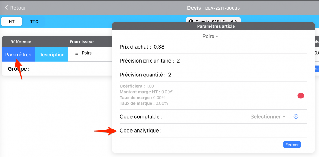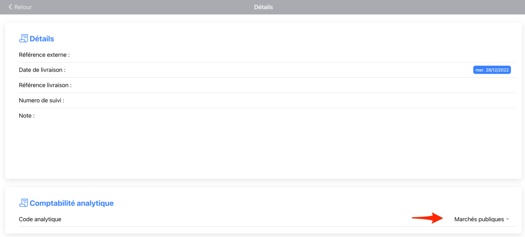 Si la fonctionnalité analytique est activée sur les documents : Depuis la création ou modification du document de vente ou d’achat dans la page « Détails » de chaque groupe. Le code analytique par défaut est proposé, il vous est possible de sélectionner une autre valeur.